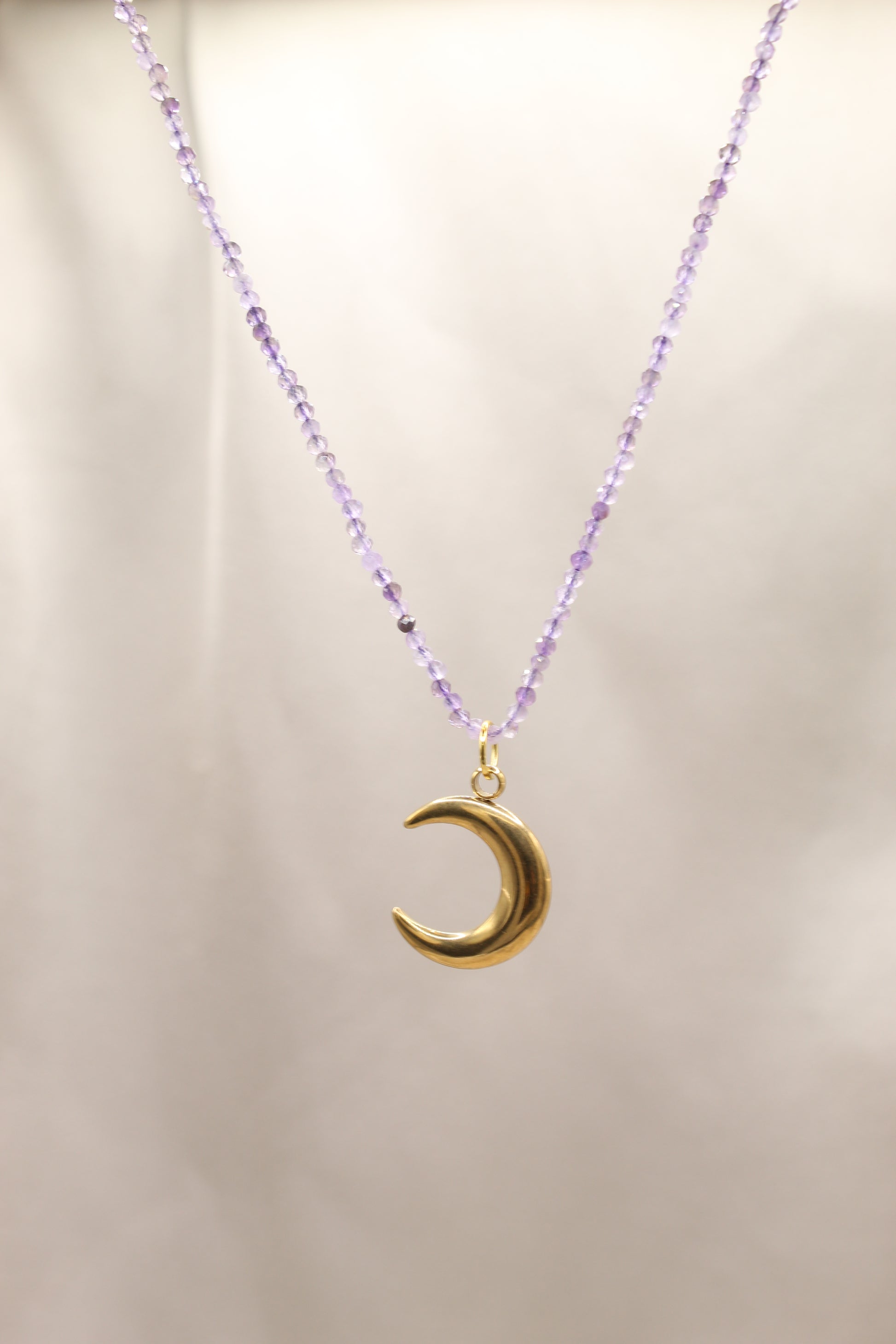 This delicate necklace features rich purple amethyst beads strung gracefully around the neck, paired with a refined gold crescent moon pendant that adds a touch of mystical elegance. The deep violet hues of amethyst harmonize beautifully with warm gold accents, creating a piece that’s both soothing and timeless.