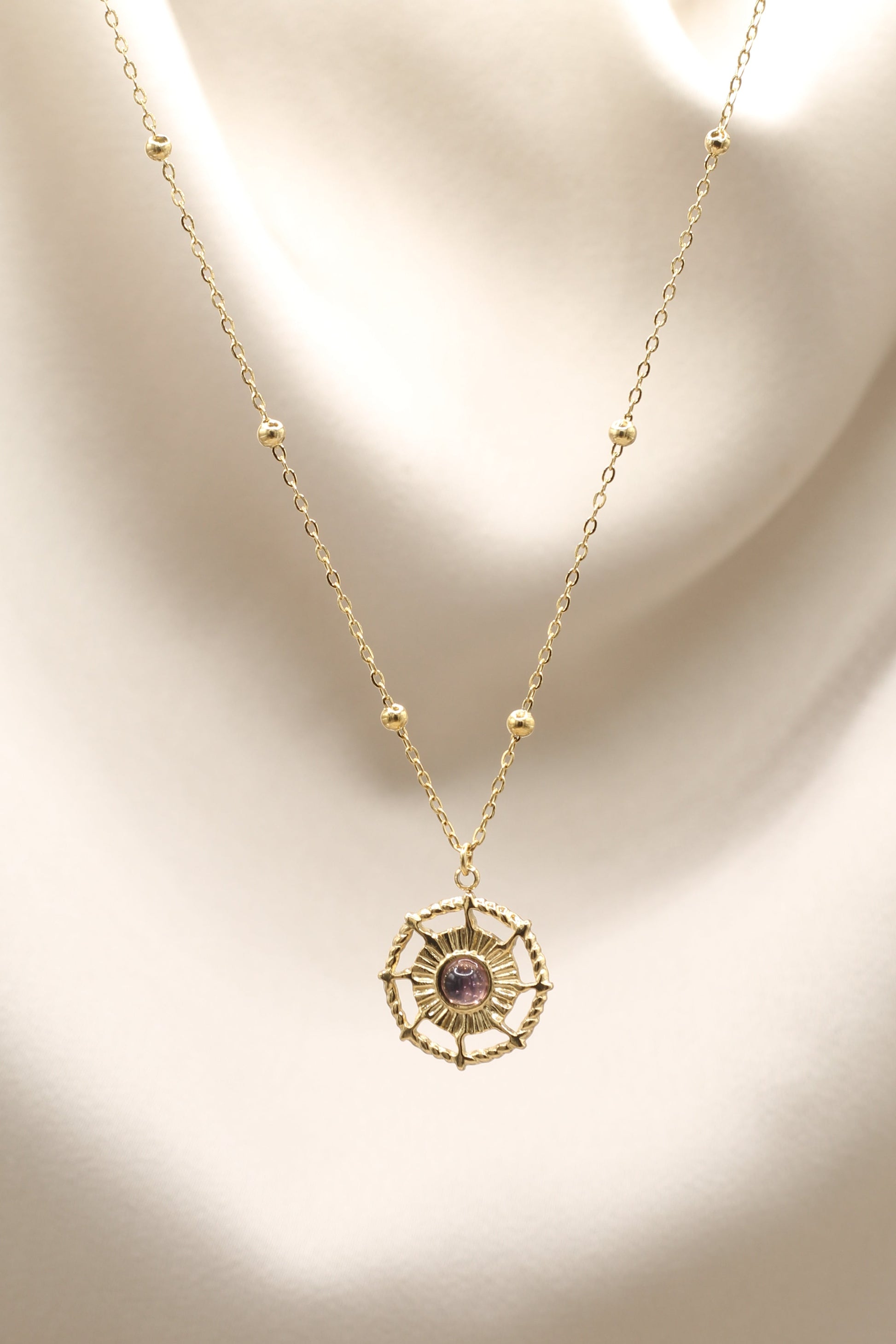 Navigate life with clarity and purpose wearing this beautifully crafted gold-plated necklace, featuring a compass-inspired pendant accented with a serene Amethyst crystal. Designed to combine elegance with spiritual guidance, this piece is both a stylish accessory and a meaningful talisman.