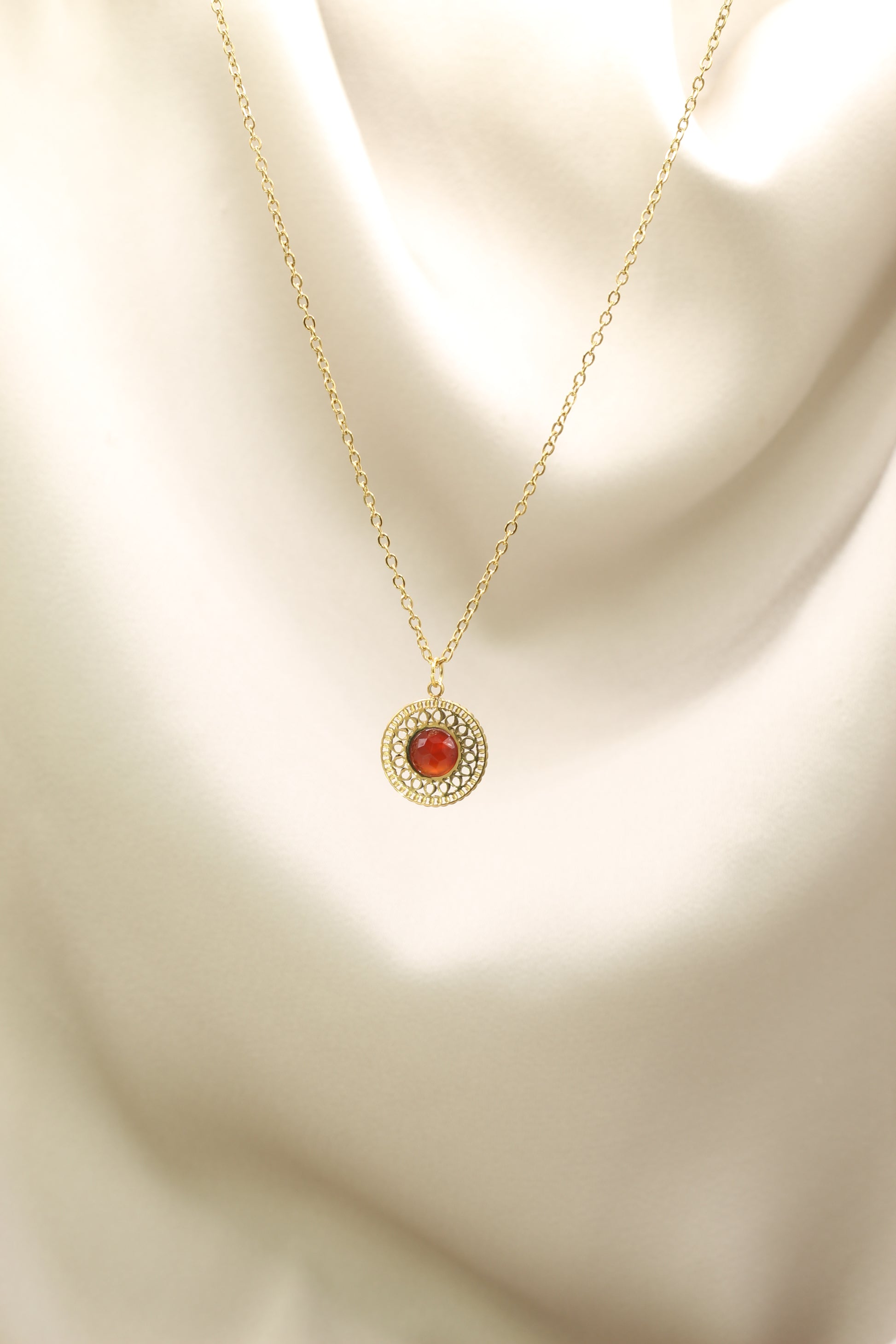 Discover inner harmony and move with vibrant confidence with this beautifully crafted 14k gold plated necklace, featuring a mandala-inspired pendant strung with fiery natural Carnelian crystal. A delicate yet energizing piece designed to center, ignite, and inspire.