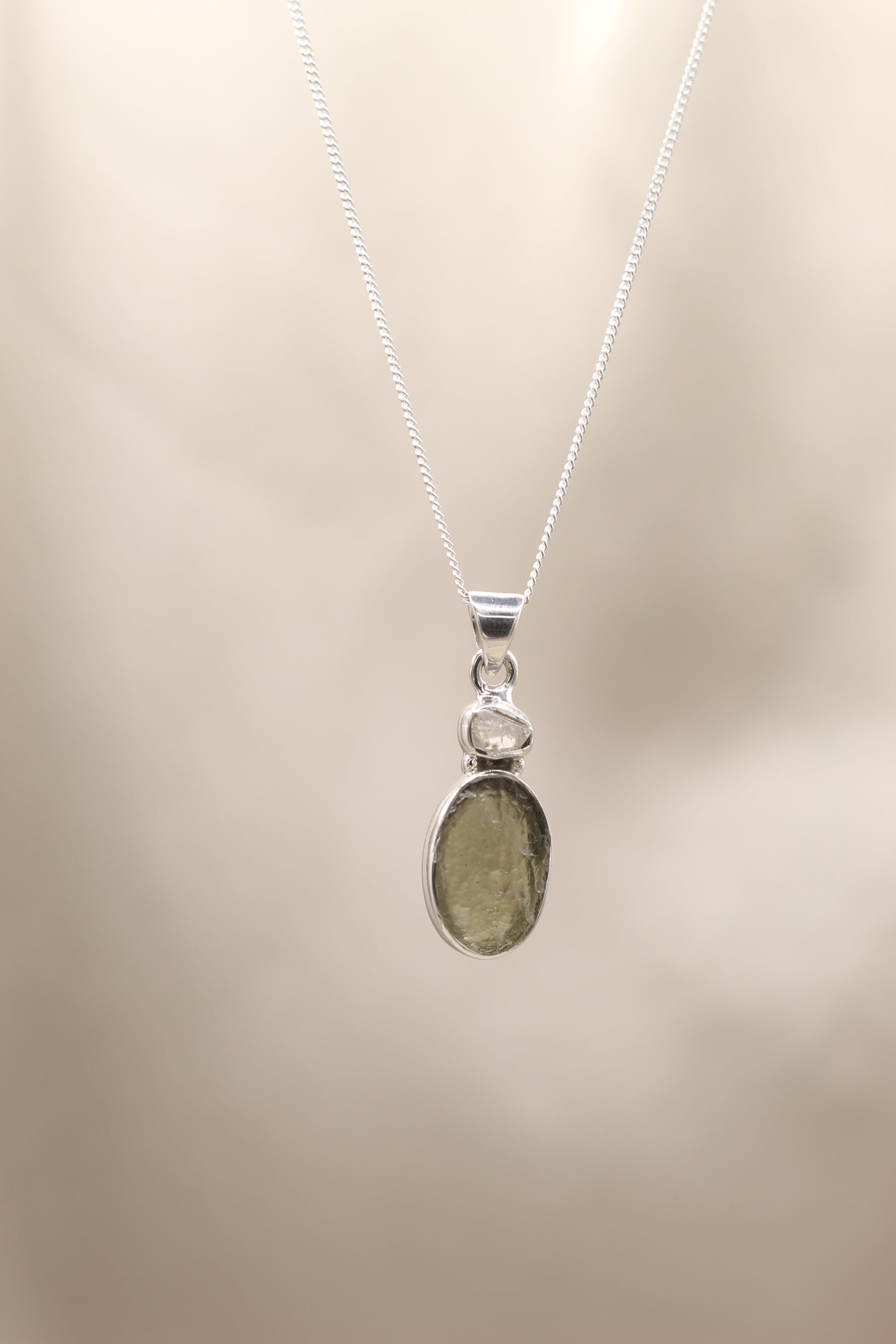 Moldavite Oval & Herkimer Necklace | Sterling Silver