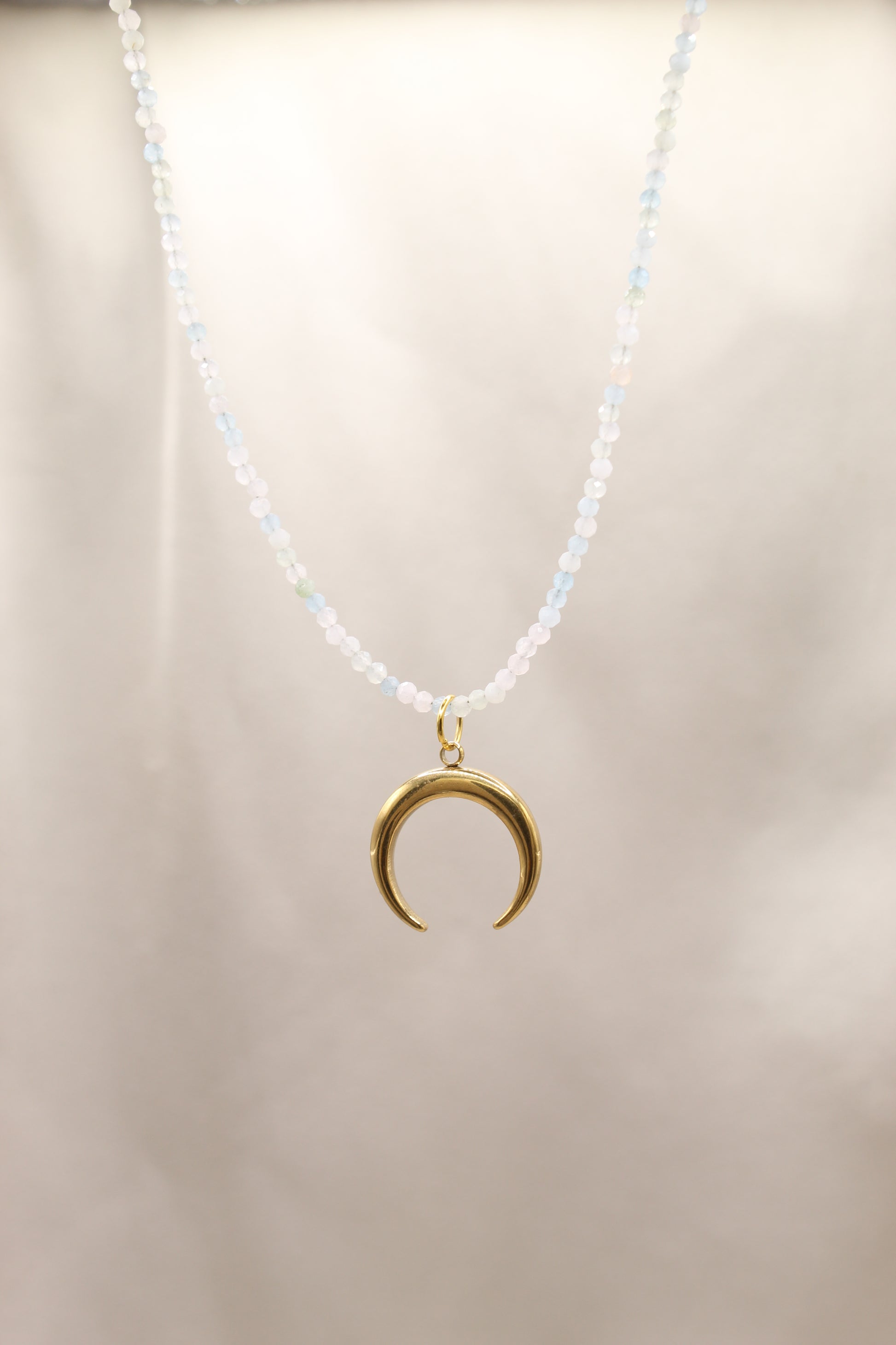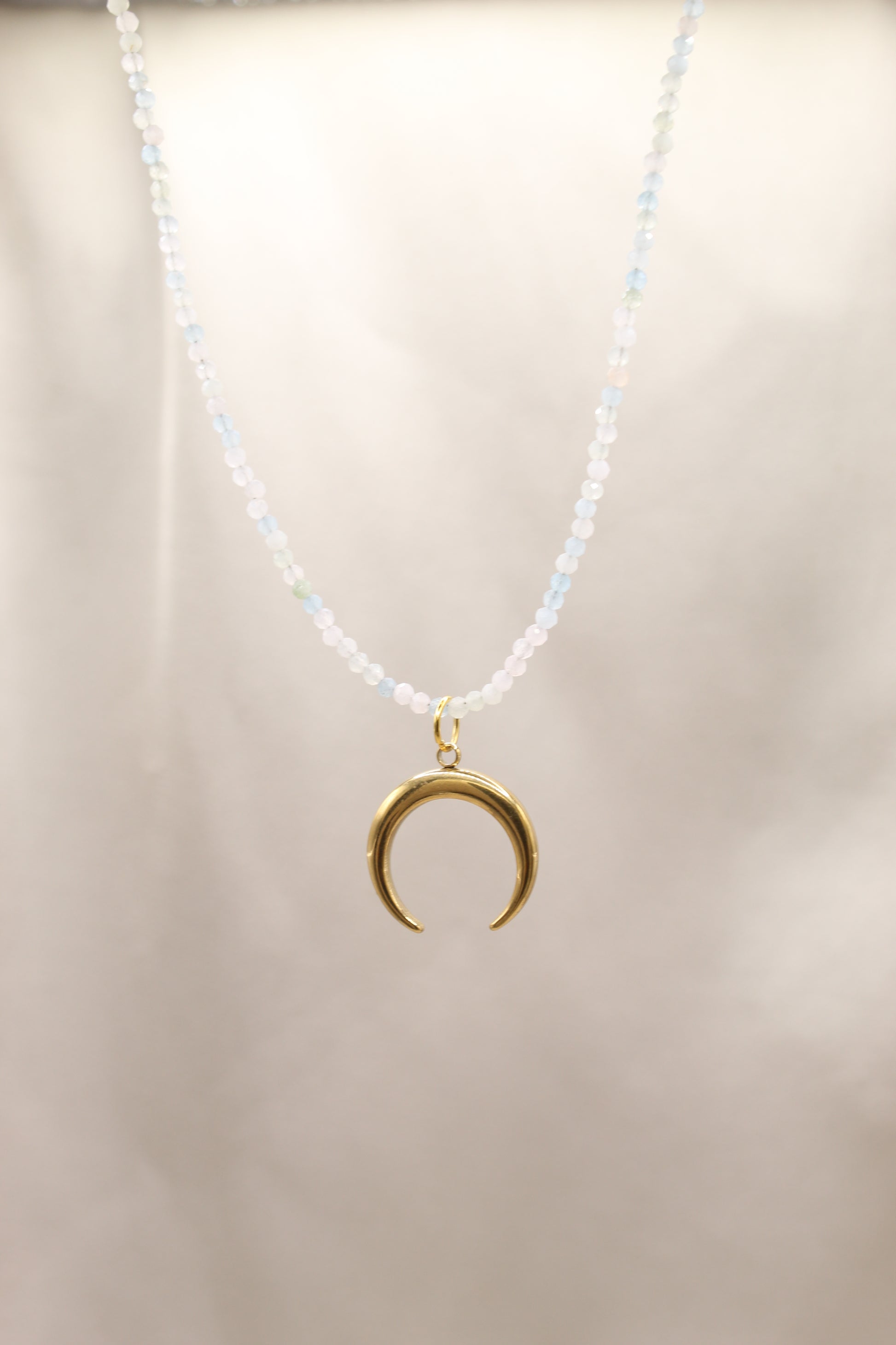 This delicate necklace features soft blue morganite beads strung gracefully around the neck, paired with a striking gold moon pendant that adds a touch of celestial elegance. The gentle blue hues of the morganite harmonize beautifully with the warm gold accents, creating a piece that’s both calming and timeless.